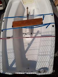 Presente un gioco di vele e bozzelli originali in buone condizioni, ho sostituito il bozzello della scotta della randa con uno con strozzascotte, ed aggiunto il segnavento in testa d'albero. Portello del gavone originale ed in buono stato. Deriva e timone in legno in condizioni più che discrete, rispetto alle foto ho rimosso la panchetta e lasciato solo gli strozzascotte per le scotte del fiocco, ma la panca è ancora disponibile. Lo scafo in vetroresina ovviamente ha i suoi anni, ma è in buone condizioni, eccezion fatta per una sbeccatura sul dritto di prua dovuta all'ultimo rientro un po' gagliardo in rampa, da allora la barca non è più stata in acqua, ho comprato della vernice per ripararlo ma non l'ho ancora applicata e viene ceduta anche quella. Presenti anche remi, scalmi, pagaie, ancoretta e parabordi. Cedo completa di ruote di alaggio "collassabili" per essere caricate a bordo in caso di uscita in luoghi non attrezzati.