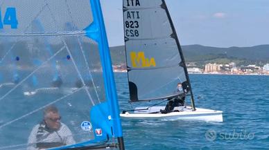 Barca completa di armo Gold e Blu, 2 teli sopra, telo sotto, sacca deriva e timone, sacca albero, segnavento e tacktick. Carrello alaggio in alluminio completamente smontabile con ruote imperforabili.