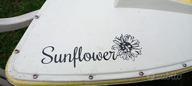Deriva sunflower peso 35 chili trasportabile sul tetto dell'auto Da utilzzare a remi a vela e a motore ( motore elettrico compreso con libretto ) copertura compresa visibile ad Arona . Disponibili su richieste altre foto .