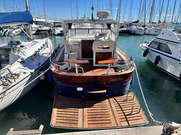 Descrizione Gozzo di 10 metri, natante motorizzato (2) VM 320 hp,consuma 70 l/h a 22 nodi di crociera. Sia gli spazi interni che esterni sono ampi, rispetto ai più blasonati gozzi di fattura campana i volumi fruibili sono decisamente maggiori. buone condizioni di manutenzione. Lunghezza scafo 9,90 metri (max: 10,50 metri) Larghezza 3,59 metri Velocità Massima 28 nodi Velocità di Crociera 22 nodi Dislocamento 8200 Kg Pescaggio 1,00 metri Revisione Motori Tagliandi regolari Capacità Serbatoi 800 litri Tipo Carburante Diesel Tipo Elica 4 pale Motori VM MR706LH 2 x 320 Ore di moto 770 Trasmissione Linea d'asse manutenzione regolare Serbatoi Acqua 1 x 200 litri N° Batterie 4 Carica Batterie Presente Capacità Batterie 110 Descrizione Interni Ampi spazi interni Cabina a prua con armadi e letto matrimoniale a V Ampia dinette Locale WC Descrizione Armamenti Elica di prua Lewmar, piattaforma bagno maggiorata, tendalini completi, cuscineria completa, chiusura invernale, Tv in dinette (non visibile nelle foto), caricabatterie Quick Descrizione Strumentazione GPS Raymarine C120 con radar Autopilota Raymarine Flap Lenco incarico esclusivo di vendita provvigioni di agenzia del 5% + iva Visibile in mare