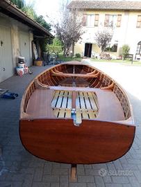 Barca di 3,8 mt in legno di mogano completo di tutte le dotazioni pronto a navigare. Comprende anche un carrello come invaso e per la movimentazione a 4 ruote e un carrello per l'alaggio.