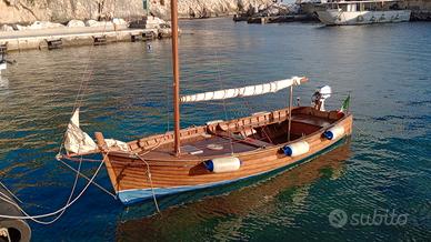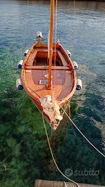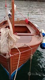 Dingotto (5 mt) del cantiere Montisola dei F.lli Archetti con deriva basculante (perciò comodamente carrellabile), dotato di randa con vang tessile, genoa e fiocco con carrelli con strozzascotte integrato (tipo deriva, più efficaci del sistema originario), batteria con pannello fotovoltaico e regolatore di carica, fanale di poppa, pompa di sentina, doccia (a poppa) con autoclave e serbatoio 32 litri (nel gavone di prua), cuscineria, tavolo apribile, cagnaro, telo copri barca e invaso in legno originali, remi, mezzo marinaio, parabordi, ancore, ecc., vendo in blocco con carrello porta barca 2021 e fuori bordo Honda 5cv del 2022 con serbatoio 12 litri, tutto in OTTIME condizioni!!!