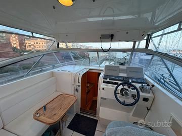 Faeton moraga 980 open del 2007 con due motori yanmar da 315 cV con 640 ore tagliandati . Il Fisherman ha 4+1 posti letto , bagno , cucina , lavandino , frigo e fornelli , microonde , tv ,aria condizionata , inverter , elica di prua . Ha due strumenti garmin da 12 , pilota automatico , vhf , vasca del vivo e lavandino esterno in un mobiletto dedicato , pompa lavaggio pozzetto .Chiusura t top nuova e doppi comandi nel flay . 4 prese mulinelli elettrici ,porta canne in acciaio . Velocità di crociera 22 massima 29 kt. Cuscineria come nuova interna ed esterna .la barca é come sciallino pursuit , tiara , mimi , lursh, calafuria il prezzo é 95.000.00?