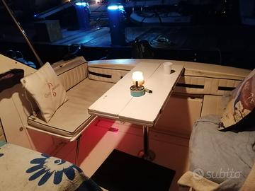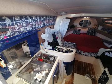 Scafo con una formidabile tenuta di mare, motore volvo penta diesel 200cv, portato a 0 ore nel 2021 attualmente 300 ore sostituzione corno di scarico, raiser e trim. Consumi irrisori (30 lt/h) trasmissione piede volvo penta 290 duo prop, velocità di crociera 20 nodi e massima 27! acqua 200 lt, gasolio 230 lt, wc nautico elettrico, VHF, salpa ancora elettrico (con doppi comandi a prua), boiler nautico, doccetta esterna ed interna con pozzetto acque grigie, cucina con 2 fuochi, frigo, caricabatterie quick sbc 250, casse sony marine, luci led in cabina gavoni e motore, luci subacquee e pozzetto, spiaggetta di poppa maggiorata con ingresso comodo fatto quest'anno. 3 posti letto in cabina. Attualmente rimessata in cantiere dallo scorso anno. Solo motore e piede valore 12500? Formula vista e piaciuta