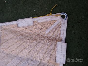 FIOCCO (East Wind) in buone condizioni (alcuni punti della banda UV rivestiti in dacron) MATERIALE: FF/KEV. GIALLO DIMENSIONI: 15,45 (inferitura) / 15,10 (balumina) / 7,00 (LPG) GRATTILE: 4,7 mm SUPERFICIE: 54,1 mq