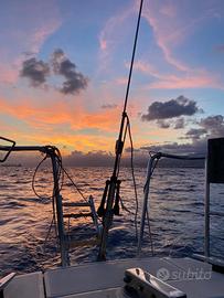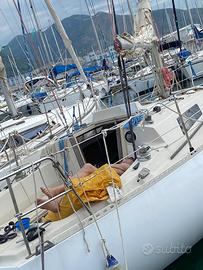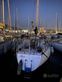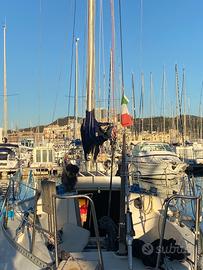 Lunghezza: 9,04 m -Larghezza: 2,86 m -Pescaggio: 1,70 m -Dislocamento: 3,2t -Velatura: 49,75mq Carena profonda, stabile, con una spiccata attitudine boliniera, barca ben bilanciata e in grado di sopportare tutta la velatura anche con venti sostenuti. Schede tecniche sui siti Dotazioni: - Vele: randa con 2 mani di terzaroli, 2 genoa (uno nuovo), una tormentina, Spi, Lazy Jack, Lazy Bag, albero poggiato in coperta, sartiame in ordine, n. 6 winches di coperta, timone a barra. - Attrezzatura di coperta e manovre correnti in ordine - Motore: Drophin (Renault) 12,5 CV appena revisionato zero ore, n. 2 batterie, salpa ancora elettrico, pilota automatico, vhf. - Impianti elettrici interno ed esterno in ordine - Coperta in buono stato, attrezzatura efficiente e completa - n. 2 osteriggi passa-uomo, di cui uno in cabina di prua - Tender pneumatico, motore fuoribordo 3 CV. Layout interni: 5 cuccette, di cui una armatoriale a prua, 2 in quadrato + cuccetta di guardia; tavolo centrale abbattibile, tavolo carteggio; cucina a scomparsa 2 fuochi e lavello, ghiacciaia; bagno passante tra cabina di prua e quadrato, wc marino e lavabo; cuscineria interna, cuscineria esterna completa.