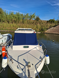 La barca ha un grande pozzetto comodo per la pesca, e' adatta anche per piccole crociere con un cucinino e un bagno in locale separato con wc marino elettrico.