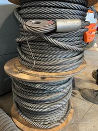 Vendo N.2 bobbine di fune, diametro fune 20mm, fili in acciaio, carico di rottura minimo 38239kg, completo di manicotto. NB: 10/15 metri di fune sono rovinati