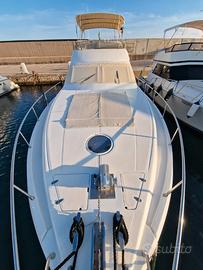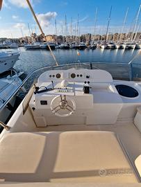 Sul fly troviamo grande seduta per ospiti con tendalino, plancia comandi con seduta e frigorifero.
