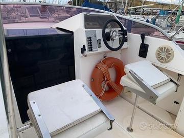 Giò Mare 202, Semi cabinato, omologato n.6 posti, lunghezza 6,35m, larghezza 2,20m (+ spiaggetta). Motore entro fuoribordo Volvo Penta benzina da 2500 cc e 146 cv, anno 1987. Serbatoio benzina 120 Litri, impianto elettrico con doppia batteria, salpa ancora elettrico, pompa di sentina, telo copertura, dotazioni classiche, 1 cabina con letto matrimoniale per 2 persone, 1 tavolo esterno rimovibile, cuscineria completa. Sempre acqua dolce. Funzionante, pronto per l'utilizzo! Attualmente in acqua per eventuale visione e prova a mare.