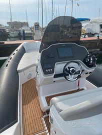 Gommone 2BAR modello 82 motorizzato con 2 x 150Hp Mercury giugno 2022, con circa 250 ore di navigazione. Dimensioni 8,20, carrellabile da sgonfio. Full optional: Copri tubolari, cuscineria completa di prua e di poppa, tendalino completo con tenda per campeggio nautico e prolunga tenda a prua, locale con wc elettrico sotto la consolle, con maceratore per scarico diretto o serbatoio acque nere. Sulla consolle sono installati ad incasso numero due display Garmin touch screen, uno da 12" ed uno da 5" entrambi interfacciati con i motori per i dati e riportano il navigatore e l'ecoscandaglio. Installato telecamera nuova a prua per il controllo dell'ancora, visibile sul Display. Radio stero fusion con amplificatore, copri consolle, timoneria elettroidraulica Seastar , volante sportivo, salpa ancora con ancora in acciaio inox con 50 metri di catena, bussola, parabrezza fumè, frigorifero sotto seduta con lavandino e fornello a gas, carica batterie elettronico con cavo banchina, doccetta esterna a poppa con serbatoio da 90 lt. e serbatoio carburante da 300 lt. Ampie spiaggette di poppa, in simil teak su piano di calpestio e scaletta di risalita ad scomparsa. Completo di dotazioni di bordo.