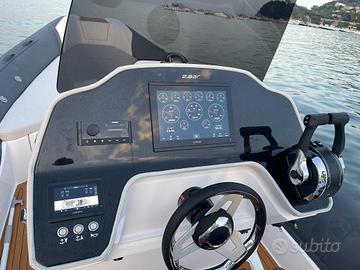 Gommone 2BAR modello 82 motorizzato con 2 x 150Hp Mercury giugno 2022, con circa 250 ore di navigazione. Dimensioni 8,20, carrellabile da sgonfio. Full optional: Cuscineria completa di prua e di poppa, tendalino completo con tenda per campeggio nautico e prolunga tenda a prua, locale con wc elettrico sotto la consolle, con maceratore per scarico diretto o serbatoio acque nere. Sulla consolle sono installati ad incasso numero due display Garmin touch screen, uno da 12" ed uno da 5" entrambi interfacciati con i motori per i dati e riportano il navigatore e l'ecoscandaglio. Installato telecamera a prua per il controllo dell'ancora, visibile sul display. Radio stereo Fusion con amplificatore, luci di manovra sul roll bar, copri consolle, copri tubolari completo, timoneria elettroidraulica Seastar , volante sportivo, salpa ancora con ancora in acciaio inox con 50 metri di catena, bussola, parabrezza fumè, frigorifero sotto seduta con lavandino e fornello a gas, carica batterie elettronico con cavo banchina, doccetta esterna a poppa con serbatoio da 90 lt. e serbatoio carburante da 300 lt. Ampie spiaggette di poppa, in simil teak su piano di calpestio e scaletta di risalita ad scomparsa. Completo di dotazioni di bordo. Il gommone in ormeggio rimane fuori dall'acqua sopra una zattera galleggiante, garantendo una carena sempre pulita, mantenendo massime prestazione della carena riducendo la manutenzione della stessa. Il battello è visibile nel porto di Cervia (RA). Prezzo richiesto del gommone € 75.000 Prezzo richiesto completo di zattera galleggiante € 85.000