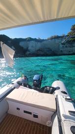 Gommone 4.30 in pvc, chiglia pneumatica, pratico per chi ha poco spazio in quanto trasportabile in un borsone. Il gommone comprende anche i gavoni in legno resinato con alloggiamento speaker, fianchetti laterali in vtr con scaletta in acciaio 4 gradini telescopica, ecoscandaglio garmin, cuscineria, paiolato rivestito in teak sintetico in Eva e ancora. Ottima tenuta. Ha solo due anni, tubolari in pvc. Essendo leggero è motorizzabile anche con fuoribordo di 6/8 cv fino a 25. Prezzo leggermente trattabile.