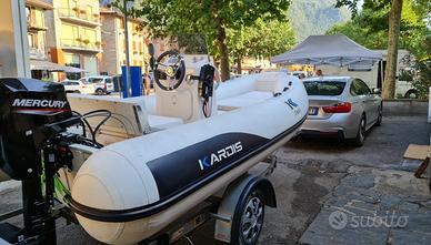Gommone Jimmy Kardis Marine 4 metri in hypalon (neoprene) autosvuotante con motore Mercury 20 cv, completo di carrello con revisione valida fino a giugno 2025.
