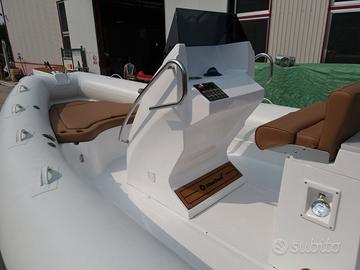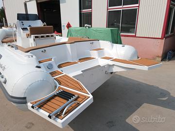Solido, spazioso e performante Prezzo promo per battello pronta consegna, in foto: € 32.000,00 Accessori standard: o Tubolare ORCA : Ice white; o Maniglie di sicurezza in tessuto; o Cuscineria standard removibile; o Rivestimento parziale coperta in TEAK SINTETICO (plancette poppa/musone prua); o Finitura pozzetto con diamantatura antiscivolo; o Prendisole di prua con gavone sottostante; o Divano di poppa, con cuscineria removibile, schienale imbottito e vano tecnico sottostante; o Seduta di guida con doppio sedile reclinabile, per guida in piedi o da seduti; o Tavolo a scomparsa e porta calici; o Tienitibene in acciaio inox 316; o Plancette di poppa con scaletta da bagno in acciaio inox; o Maniglione di risalita laterale, inox; o Consolle di guida con parabrezza oscurato; o Volante inox; o Pannello interruttori con finitura carbonio; o Bussola; o Kit doccia con autoclave; o Batteria da 80 Ah o Musone di prua con rullo; o Salpa ancora elettrico 900W con ancora da 7.5 kg e catena 35 m; o Golfari di poppa e di prua; o Pompa di sentina elettrica; Motorizzazione consigliata 150 cv. Possibilità di acquisto in package con HONDA 150, Mercury 150cv o Tohatsu 140cv. Visibile e disponibile in pronta consegna presso il nostro showroom di Marsala (TP). Contattaci per ulteriori informazioni o per fissare un appuntamento.