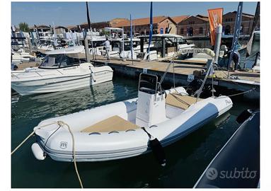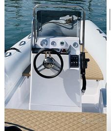 Gommone italiano, Made in Italy. 5,80 metri fuori tutto. Chiglia in vetroresina e tubolari in ORCA. Ampi gavoni a bordo. Doppio prendisole a prua e poppa. Prezzo indicato per il gommone, non include motore fuori bordo Mercury 40 cv.
