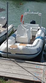 Gommone Alson 6,60 del 2003, categoria B, in buone condizioni, con motore Mercury NUOVO (modello F150L del 2023) usato solo 10 giorni, con impianto stereo con lettore CD, cuscini prendisole, tendalino, luci, doccia, teli di copertura su misura, 2 taniche di benzina, salvagenti ed ecoscandaglio e gps cartografico inclusi.