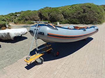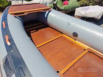 Vendo meraviglioso gommone smontabile ASSO 38, costruito in neoprene con paramezzale e pagliolato in lego, remi originali con scalmo ad attacco rapido, tutto in perfetto stato e tenuto maniacalmente. La vera rarità di questo esemplare è il suo certificato di omologazione originale del costruttore, con matricola imbarcazione e caratteristiche costruttive, che consente la portata di 5 persone effettive. Il motore è un Evinrude "521", che sebbene datato (1983) è assolutamente perfetto e mai modificato con il carburatore originale, certificato di potenza, serbatoio da 30lt e serbatoio da 15lt. Il motore è perfetto e affidabilissimo, con ottimo regime del minimo, sempre lavato insieme al gommone dopo le uscite in mare e fatto girare in vasca. Il gommone è dotato di ruote di alaggio grandi in acciaio inox. Nella vendita è compreso un eccezionale telo in PVC ultra protettivo, che copre l'intera imbarcazione ed il motore. Sempre compreso nel prezzo il carrello di prua della TREM in acciaio, al quale è stata applicata una modifica (comunque removibile) che lo rende sterzante a tre ruote, due fisse ed una piroettante che consente di movimentare da soli (il solo carrello costa circa 125,00 euro e la ruota aggiuntiva 50,00 euro). Inoltre sono comprese due sacche nautiche con dotazioni complete entro 3 miglia (anulare con cima galleggiante, kit fuochi, ecc...) giubbetti nuovi per 5 adulti + 2 bambini, due rulli di alaggio nuovi, scala di risalita in corda con gradini in nylon, ancora a ombrello da 5 kg con 2mt di catena e 30mt di cima e avvolgi cima, oltre a molti altri accessori (tra i quali mezzo marinaio, tre taniche benzina in plastica ed una in metallo per trasporto sicuro, kit per fare miscela e olio marino, ecc...). Il battello è visibile in zona è Montalto di Castro (VT).