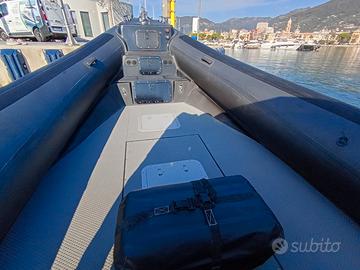 Gommone professionale di costruzione italiana, equipaggiato con doppia motorizzazione Yamaha fuoribordo da 300 hp ciascuno. L’allestimento è pensato per operazioni rapide, escursioni, impieghi tecnici o tenderaggi, con sedute individuali dotate di cinture, consolle centrale con parabrezza, e strumentazione completa. Il ponte è rivestito in materiale antiscivolo, con ampi gavoni stagni e accessi tecnici ben distribuiti. A prua è installato un verricello elettrico Quick con ancora e catena inox, mentre a poppa si trovano due motori protetti da coperture e impianto carburante ispezionabile. Ottime condizioni generali, pronta all’uso.