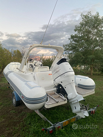 vendo splendido battello Bat Indian 6.80, motore Suzuki 150 CV con circa 800 ore (tutto 2007), senza carrello, tenuto in modo maniacale, omologato per 12 persone, spiaggette di poppa in teak, doccia 100 litri, serbatoio acciaio 250 lt, stereo con sub woofer, verricello salpa ancora con comando sulla consolle e 30 metri di catena, tubolari risanati completamente e trattati con rivestimento specifico 2025, tappezzeria nuova 2024, tendalino fino a prua, impianto elettrico perfetto. GPS ed ecoscandaglio Garmin, tutto perfettamente funzionante.