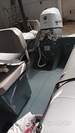 consolle Optima 800 colore grigio, sedile doppio, ancora ad ombrello da 6 kg con cima, impianto elettrico 12 v con pannello interruttori, asta 360°, luci di via, tromba, pompa di sentina in automatico, dotazioni di sicurezza ed ormeggio, scaletta in acciaio a 3 gradini, prefiltro benzina, presa usb in consolle, commissione a parte
