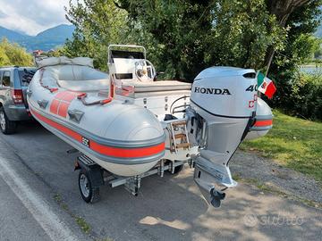 VENDESI GOMMONE BSC 46 con motore Honda BF40E 40/70 del 2019 con circa 150 ore sempre tagliando Honda. Il gommone ha navigato solo in acque dolci (lago di Como), sempre rimessato su carrello in box dedicato. Il BSC 46 è un gommone dagli spazi ottimali anche se contenuti; la posizione decentrata della console è studiata per offrire maggior confort a bordo. Lunghezza: 4,60 mt.; Larghezza: 2,30 mt.; Valvole: n° 4; Portata persone: n° 8; Peso a vuoto: 165 kg. Certificato di Omologazione RINA; Dichiarazione di Conformità; Certificazione CE. Il BSC 46 offre tre gavoni a prua, uno sotto console e due a poppa sotto il sedile guida. È perfetto per chi si vuole approcciare a questo mondo per la prima volta, non ha la patente nautica e non vuole avere costi di gestione troppo elevati. DIVERTIMENTO GARANTITO!! PREZZO 9.800,00 comprensivo di rimorchio Ellebi (da revisionare) e telo ormeggio. Trattabile solo dopo visione. Il gommone è attualmente visionabile in provincia di Bergamo ed eventualmente può essere provato in acqua se VERAMENTE interessati.