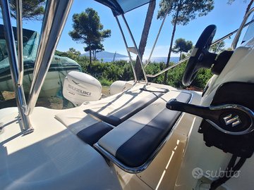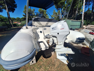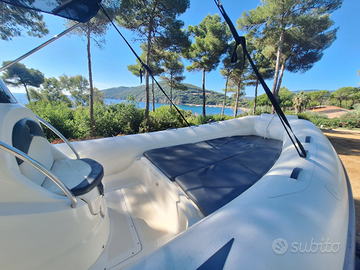 Gommone accessoriato con rollbar e tendalino inox con tela microforata, serbatoio acqua dolce + doccino, serbatoio interno acciaio 100lt.
