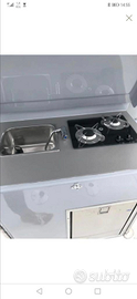 Posteriormente alla postazione di guida un mobile spazioso ospita il cucinino a due fuochi, il lavello ed il frigo oad incasso