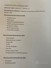 Gommone EFB del 2006 completamente rinnovato nel 2024: tubolari, teak, catena, impianti. Cabina matrimoniale, bagno, doccie c/f, cucina esterna, prendisole poppa e prua, spiagetta in teak, tavolo pranzo in legno. Motori Mercruiser mcm 4.3 L 2x250 cv. con manutenzione completa 2024/25 e tagliandi regolari da officina Mercury. Tendalino maxi con prolunga araba, frigo, GPS/Eco, verricello, wc elettrico. Ottime condizioni generali.