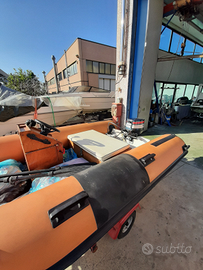 Vendesi gommone BAT BALTIC m 4,20 e motore fuoribordo Yamaha 25 con avviamento elettrico, consolle con timoneria e tavolino a scomparsa , panca con cuscineria, cuscineria prua, carrello Ellebi revisionato fino al 2027. Poche ore di moto. Perfetta tenuta aria dei tubolari, pompa elettrica aspirazione acqua, telo copriscafo e scaletta per risalita. Dotazioni di bordo quasi complete.