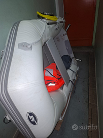 Gommone con 2 ruote di 2 metri omologato per 2 persone con annesso: kit completo di salvataggio, ciambella, ancora, razzi da segnalazione, 2 canne da pesca da fondo e motore di piccola cilindrata. Tutto 600 euro