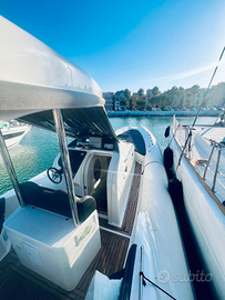 Vendesi Gommone Cantiere D' Oriano Marine modello Domar 10 oltre 11 metri di Gommone omologato natante 9.99 costruzione 2023, Con Rol bar, teck naturale, aria condizionata, grande cabine a prua, con bagno sperato e wc marino elettrico, cuscineria completa come nuova, due tendalini e chiusura a 360° , frigorifero esterno, cucina con piano induzione esterno, con lavzndino, esterno impianto stereo Fusion con 6 casse + subwoofer, tavolo a scomparsa nel pozzetto, timoneria idraulica, predisposizione TV in cabina, impianto 220v con carica batterie, GPS con radar Garmin 12 pollici, salpa ancora elettrico con segna catena e telecomando, VHF Garmin con AIS . Viene consegnato con antivegetativa fatta nuova e tagliando motori fatti.