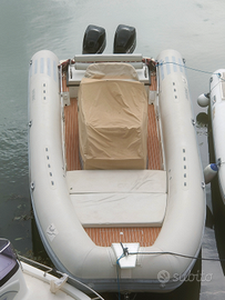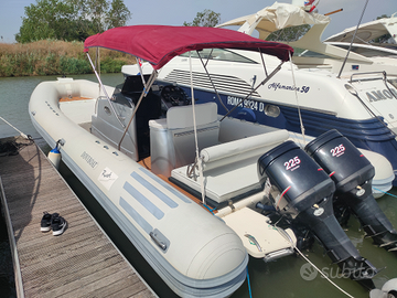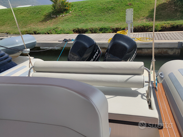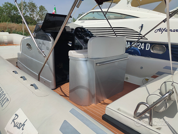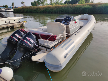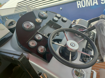 Doviboat One way 100 anno 2006 full optional 2 posti letto, motorizzato con 2 motori mercuri da 225 CV fuoribordo optimax del 2003, 740 ore di moto con cosumo 70 litri/h velocità max 45 nodi tubolari da 70 cm. Al momento è in fase di restyling , bottazzo parabordo nuovo ed altri lavori pavimentazione,tappezzeria . 3 batterie da100amp. GPS, pilota automatico radio stereo, wc chimico, a poppa,Esamino permuta parziale gommone inferiore di mio gradimento. Non vendo i motori separatamente.