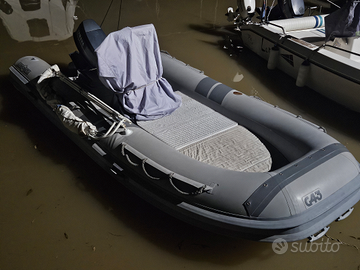Gommone tenuto bene. Nessuna perdita sui tubolari. Cuscineria completa, tendalino, pompa di sentina, e dotazioni entro le 3 miglia. Portacanne in acciaio. Motore Yamaha top 700 cavalli 25/50. Carrello per il trasporto su strada compreso.