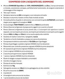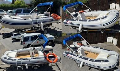 ATTENZIONE: o Il prezzo riportato si riferisce all'acquisto del gommone, del motore e del carrello TUTTO insieme. o Vendo anche solo il gommone, è presente un'altra mia inserzione dedicata. o I prezzo NON E' TRATTABILE quindi, se ci incontriamo per visionare il gommone, intendo che abbiate già accettato il prezzo riportato. o Non vendo solamente il carrello Per altre foto e caratteristiche del carrello contattatemi in chat che vi mando tutto. Il carrello è stradale, omologato e con revisione in scadenza ad Aprile 2026. DESCRIZIONE DEL GOMMONE: Gommone HONDA in PVC come da titolo NUOVO MODELLO. Lunghezza 4mt e larghezza 1,90mt Chiglia pneumatica, acquistato NUOVO a Luglio 2024 quindi ancora in garanzia ufficiale HONDA. Accessori inclusi nel prezzo visibili della descrizione in foto. Il gommone si presenta in ottimo stato, sempre lavato con acqua dolce dopo ogni uso, mantenuto sempre su carrello e ben coperto, condizioni perfette, NESSUNA MICROPERDITA, NESSUNA RIPARAZIONE AI TUBOLARI, tiene perfettamente la pressione. Presenta solamente una riparazione sul telo di fondo effettuata professionalmente, invisibile dall'esterno ed eseguita in maniera perfetta. La riparazione NON RIGUARDA I TUBOLARI o CAMERE D'ARIA ma solamente il telo sotto al paiolato che fa da scafo. Viene venduto completo di documenti in regola, fattura d'acquisto, libretto di uso e manutenzione, certificato di potenza del motore, omologazione del serbatoio benzina, libretto del carrello. Tutto il gommone, volendo, è smontabile e ripiegabile nelle sue due sacche originali. Su richiesta posso inviare altre foto e video per constatare lo stato del gommone, del motore e del carrello. E' visibile a SANTA MARINELLA (RM) previo appuntamento.