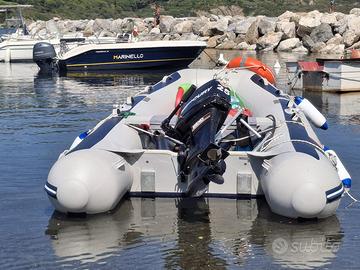 Vendo, per passaggio ad altra categoria, gommone honda t40, tenuto perfettamente, con chiglia pneumatica, paiolato in alluminio , il tutto completamente smontabile completo di panchina e sacca. Viene venduto con tutti gli accessori obbligatori per la navigazione. Completo di tendalino . Motore 25 cav. Mercury due tempi, totalmente revisionato e perfettamente funzionante.