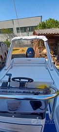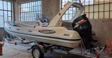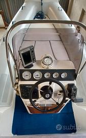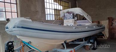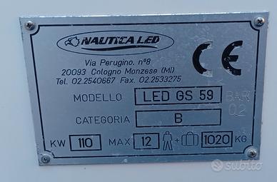VENDO: Gommone LED GS 590 (portata 12 persone)anno 2008 unico proprietario; completo di dotazioni entro 6 miglia, roll- bar vetroresina abbattibile con luci di via +cuscineria con rivestimento spugne fatte su misura, tendalino parasole, telo originale copri gommone, scaletta di risalita + plancetta per motore ausiliario, consolle di guida completa di manometri : (contagiri-carburante-trim-contaore-miglia),centralina eletrica,VHF fisso con antenna + GPS fishfinder Geonav + bussola. Serbatoio benzina 140 lt. Batterie n 2 con stacca, e impianto da caricare le batterie in banchina con il suo cavo con presa esterna , filtro decantatore, serbatoio acqua con doccetta circa 30 lt. , pompa di sentina, gonfiatore manuale, parabordi, n 2 ancore manuali, sospendite per alaggio . Tenda da campeggio nautico su misura (antivento e antipioggia) mai usata. NO Antivegetativa ; sempre rimessato al coperto, e nei mesi estivi con telo per il sole.