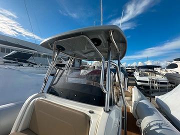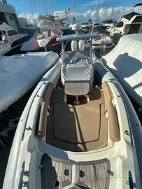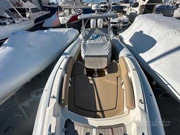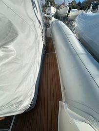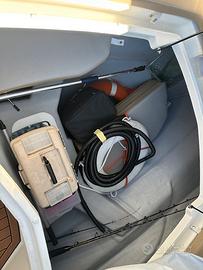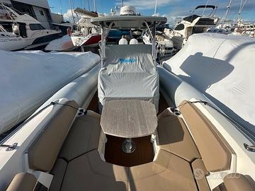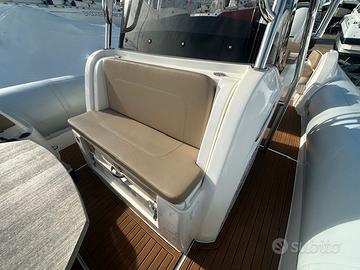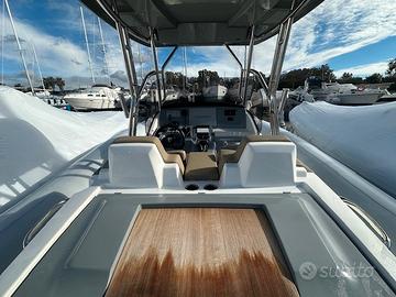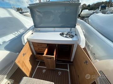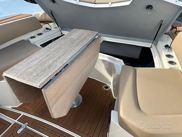 Il layout è studiato per offrire due zone distinte: una dinette a prua e una a poppa, entrambe con tavolo, trasformabili in prendisole. La grande consolle ospita un bagno completo, mentre il sedile cucina è ben attrezzato per ogni esigenza a bordo. Gli ampi spazi di stivaggio e le plance con doppia scaletta a scomparsa completano un allestimento pensato per il massimo comfort in ogni situazione.