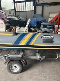 Gommone Marlin lungo 440 ottimo come prima prima esperienza nautica portata 6 posti prendisole amovibile motore 26/40 cv senza patente. Carrello stradale revisonato completo compreso.