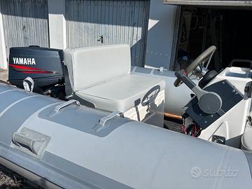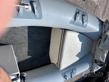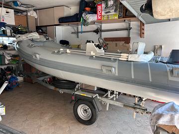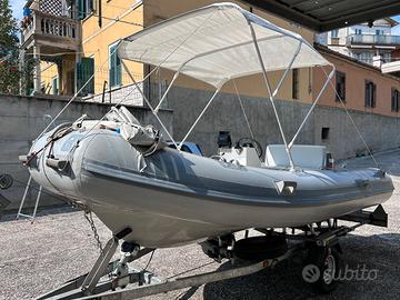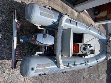 Vendo gommone Marshall M60 in ottime condizioni lunghezza 4.40 mt. larghezza 1,88 mt. marchiato CE, con motore Yamaha 30 hp 2 tempi a carburatore anno 2002, color grigio con gavoni in legno/vetroresina fatti personalmente e progettati in moda da sfruttare ogni spazio utile. Il gavone in prua (tre scomparsi: per serbatoio di benzina di 25 litri, per salvagente a ciambella e per l’ancora) ed i piani del prendisole sono tutti completamente smontabili potendo coì utilizzarlo per qualsiasi attività (pesca, pesca subacquea, sole e mare con famiglia ecc.) in modo da aumentare o diminuire gli spazi utili secondo le proprie esigenze. Un altro serbatoio di 24 litri si trova sotto la consolle di guida (con 49 litri si ha un’autonomia di navigazione importante). Il motore ha avviamento elettrico, presenti luci di via per la notte, tendalino notte e tendalino sole, scaletta di risalita, cuscineria in gommapiuma a cellula chiusa che non assorbe l’acqua ed ammorbidisce i colpi delle onde. Dietro il sedile c’è lo spazio per un frigo Igloo da 50 litri. Assieme al gommone viene venduto anche il carrello revisionato modello ELLEBI tipo LB310 – ruote R10. Sia il gommone, che il motore ed il carrello sono stati sempre mantenuti in maniera maniacale (manutenzioni annuali su tutto), tenuto in un box protetto da sole ed intemperie e sempre cerato. Vendo a malincuore per non utilizzo. Prezzo Euro 6.700 trattabili Massimo 339 8429266