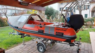 Gommone Marshall M60 in ottimo stato. Completamente accessoriato, con tiemo di copertura, roll bar, posto guida e cuscineria. Vendo con carrello di trasporto. Senza motore.
