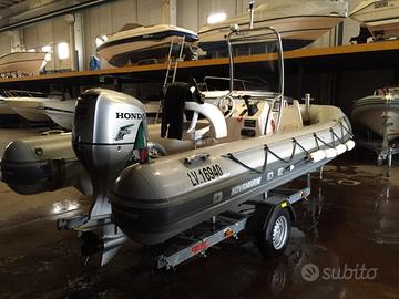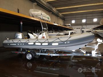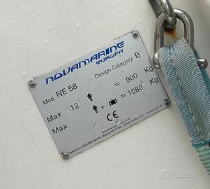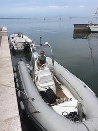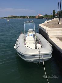 Modello Novamarine Europa NE 5.80 Anno 2012. Gommone assemblato dalla ditta su mio disegno e accessori forniti. Sedile guida (americano) a piantone 360 gradi di movimento rotatorio e regolabile in in altezza. Plancia guida con gavone provvisto di serbatoio acqua dolce e doccetta. Serbatoio benzina inox immerso sotto piano calpestio di 60 lt. Piano di calpestio in teak sintetico anti-sdrucciolo. Bitta a prua inox per ancoraggio e traino. Prendisole rimovibile a seconda delle esigenze con cuscini. Impianto stereo da ripristinare (rubato mentre era in cantiere DEC Mestre). Motore Honda 4 tempi90 HP con poco più di 300 ore di moto (vedi strumentazione di bordo). 4 Parabordi rimovibili salva bottazzo su ogni fiancata. Carrello Ellebi (acquistato nuovo solo come invaso da cantiere) recentemente revisionato come da documenti (libretto circolazione). Imbarcazione conservata sempre in capannone (tranne l'ultimo anno dopo il fallimento cantiere DEC) e lavata (scafo e motore) in acqua dolce dopo ogni uscita. Compressore elettrico per il gonfiaggio. Cime e ancora in dotazione. Cinghie per alaggio e varo da gru ancorate allo scafo.