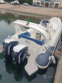 Gommone di 7,5 metri Nuova Jolly Prince 25 anno 2016, motori 2020 2 Evinrude G2 HO 150CV con manette elettroniche 180 ore. Dotazioni di bordo, doccia a poppa e prua, frigo, vhf, stereo, chartplotter, verricello elettrico con contacatena, lavello e fuoco sotto la seduta di guida, wc elettrico nel cassero centrale che fa anche da vano spogliatoio. Cuscineria completa. Manutenzione motori sempre eseguita ufficiale infatti i motori sono in garanzia. Il gommone è ormeggiato al pontile di Nisida. Carena deep V per una ottima navigabilità e consumi bassissimi. Disponibile da settembre.