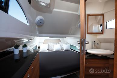 Cabina: Vetri in carena con portaoggetti, Letto due posti con ampi gavoni, Mobiletto porta oggetti (con possibilità di installazione frigorifero), Mobiletto con lavello, Paratia Privacy per WC con porta, lavabo e doccia in cabina, WC con maceratore e serbatoio acque nere con sensore bluetooth esterno, Porta oggetti, Passauomo, Specchio e profilo in legno, Luci di cortesia, Luce di lettura, Prese USB. Inoltre compreso anche Frigorifero lt 39 ( cabina ), Piano in teak sintetico ( Eva 9 mm ), T-Top vetroresina e inox.