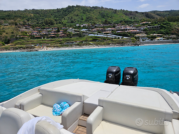 Gommone Panamera PY100, Anno 2019, lunghezza fuori tutto 13,60 m. non targato natante, motori Mercury 400 Racing con eliche a 4 pale, tubolari neri in carbonio, pilota automatico, elica di prua, cabina 3 posti letto con Aria Condizionata, bagno separato con 2 doccie, boiler acqua calda, 4 oblò, telecamera anteriore a prua per ancora e ormeggi, portellone cabina apribile elettricamente, tavolo anteriore elettrico con telecomando, ancora elettrica sia dalla consolle che con telecomando, luci a Led su tutto il calpestio, nel bagno, in cabina e subacquei, Tek su tutto il calpestio,frigorifero grande,2 ghiacciaie, cuscineria bianco perla, tendalino a poppa grande a scomparsa e arabo a prua, doccia esterna, 2 scalette risalita, sistema di navigazione grande di ultimissima generazione tutto touch screen, Super Impianto Stereo con 2 sterei uno in cabina uno in consolle, 8 Casse grandi più 1 Subwoofer, 2 Amplificatori, tutto JL Audio ecc