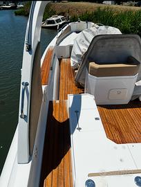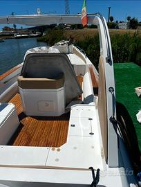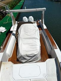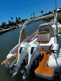 Revenger 28.70 anno 2019 2 Motori Honda 150cv V-tech 200 ore di moto anno 2020 Gavone con bagno wc elettrico Salpa ancora elettrico 40mt di catena Teak su tutta la coperta Omologato 11 persone Gommone pronto alla boa Il Revenger 28.70 è un gommone a chiglia rigida di fascia alta (circa 8,70 metri) noto per l'elevata stabilità, ottime prestazioni (oltre 30-40 nodi) e la presenza di una cabina interna. offre ampi prendisole, cucina esterna e finiture di pregio, ideale per crociere giornaliere. Specifiche Tecniche Principali: Lunghezza F.T.: - 8,75 m Larghezza: ~3,15 m Tipo: Gommone (RIB - Rigid Inflatable Boat) Motorizzazione: Fuoribordo, 2x150 hp (Honda V-tech) Velocità Massima: 30-40 nodi Capacità Carburante: ~250 l Portata Persone: ~11-12 persone Dotazioni e Caratteristiche di Rilievo: Comfort a Bordo: WC marino elettrico e TV. Coperta: Cuscineria completa, prendisole di prua e poppa, tavolo, lavandino e frigo esterni, salpa ancore elettrico. Elettronica: dotato di pacchetti Garmin (GPS, Ecoscandaglio), Materiali: teak su camminamenti e pozzetto.