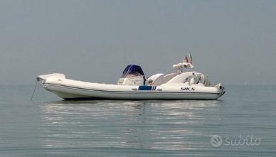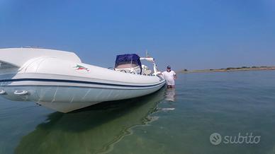Gommone di 780 cm con motore Evinrude E250DPX il tutto di luglio 2006. Perfettamente manutenuto e rimessato al chiuso. Comprensivo di tutti gli accessori originali e relativa documentazione. GPSMAP Garmin 500/700 con ecoscandaglio. Doccetta, verricello elettrico, ancora acciaio inox, cuscineria completa, tendalino, radio. Manutenzione motore eseguita pre e post stagione da ditta specializzata, disponibili fatture in visione. Visibile a Grado. Eventualmente disponibile subentro posto barca presso marina isola della Schiusa.
