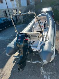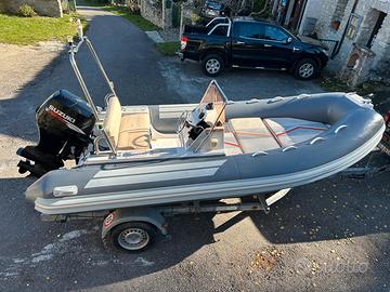 gommone Sacs 475, motorizzato Suzuki 70cv quattro tempi revisionato, tubolari perfetti, cuscineria completa, tendalino, serbatoio in acciaio, pompa di sentina, radio con due casse. Carrello Cresci portata dieci quintali appena revisionato.