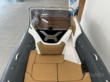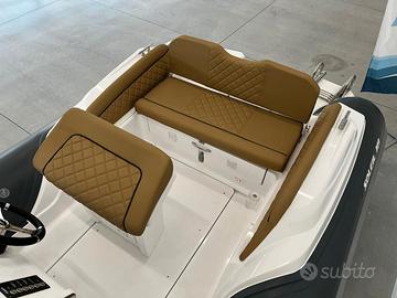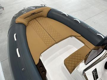 Gommone molto spazioso ed elegante. E' capace di unire prestazioni ottimali a comfort della vita di bordo grazie alla prua molto larga e alla predisposizione prendisole di poppa che permette di avere due grandi prendisole.