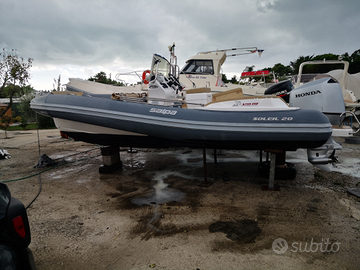 Salpa soleil 20 grigio Grey fabric, anno 2021,motore 150cv Honda con manetta elettronica anno 2023 ore moto 100,garanzia full, battello full optional, stereo Hertz con amplificatore 1500watt.4 altoparlanti e Sub ,teak su plancette prolungate ed a prua, Tendalino con prolunga fino a prua e laterali, salpa ancora italwinch con comandi a prua ed in consolle con contacatena e con stacco di sicurezza, catena zincata da 50mt,doppia batteria da 100 hamper, Garmin 92v nove pollici GPS ed ecoscadaglio, faretti led illuminazione pozzetto e plancette di poppa.N. B. Omologazione motorizzazione 150cv.